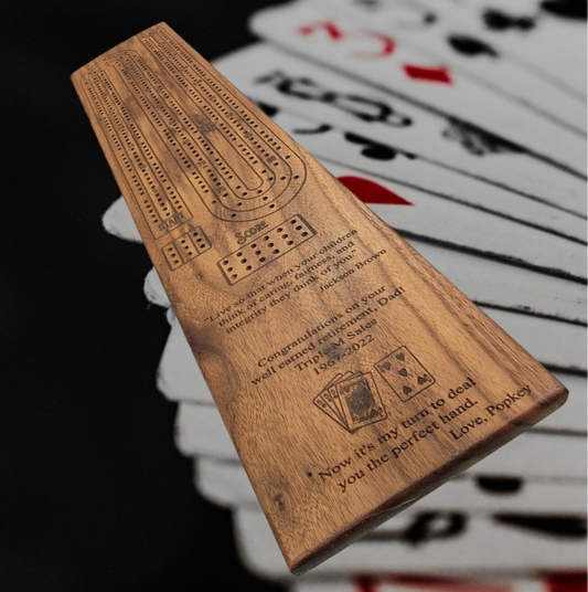 Handcrafted Province wood Cribbage Boards with peg storage. A practical gift for all occasions.