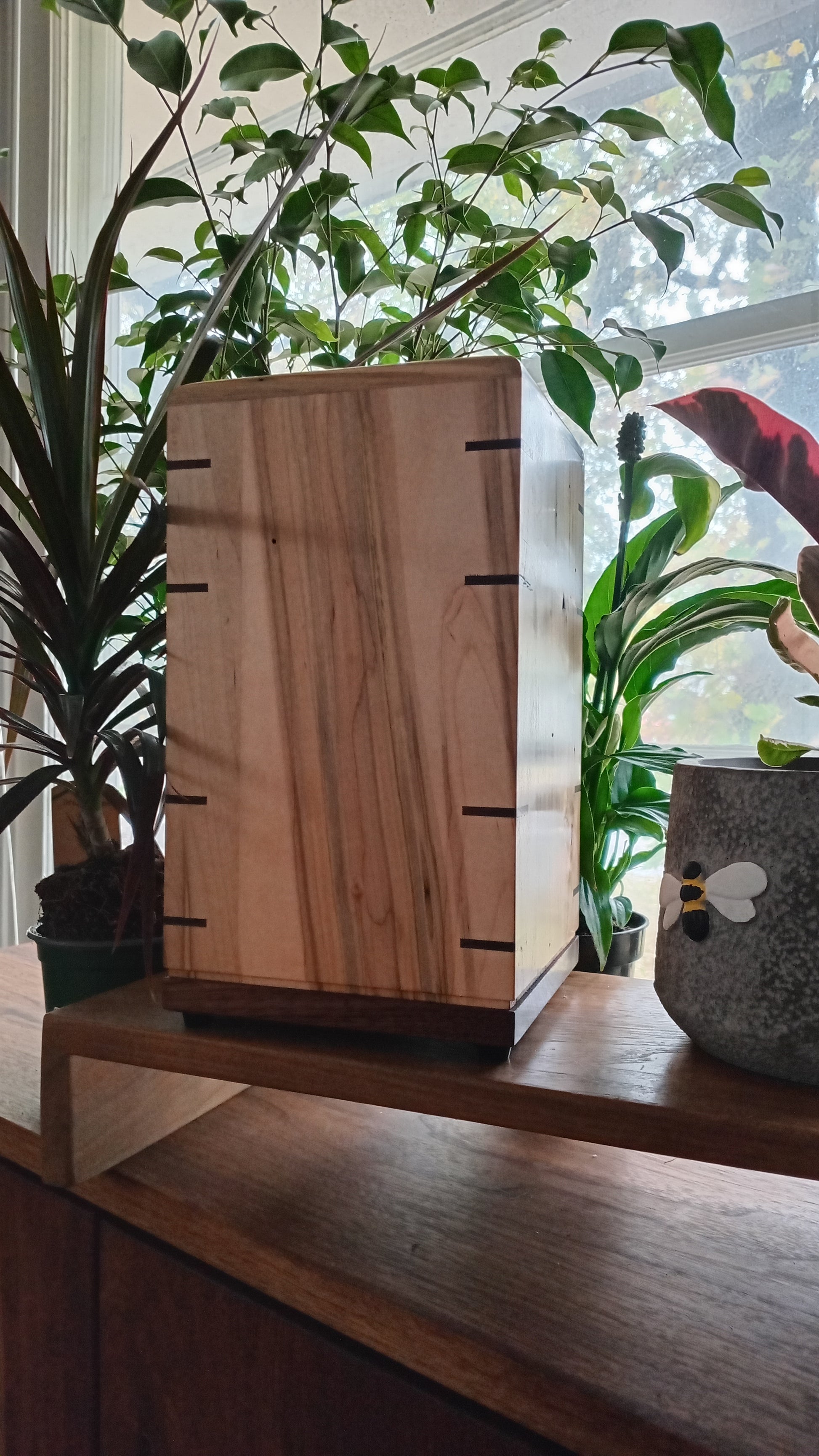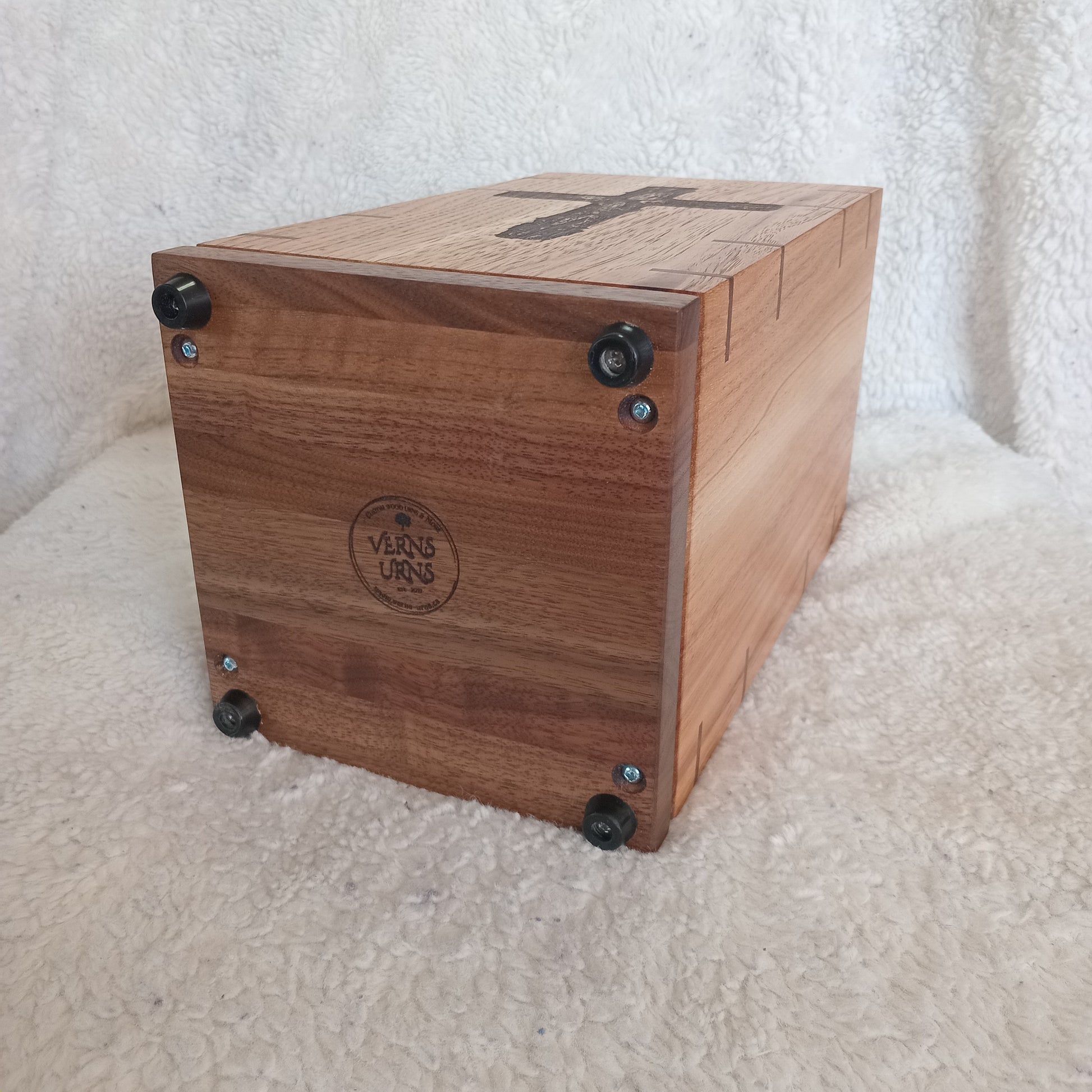 Handcrafted from sustainable hardwoods and finished in all natural oils. Can be displayed, placed in a Columbarium, or buried.