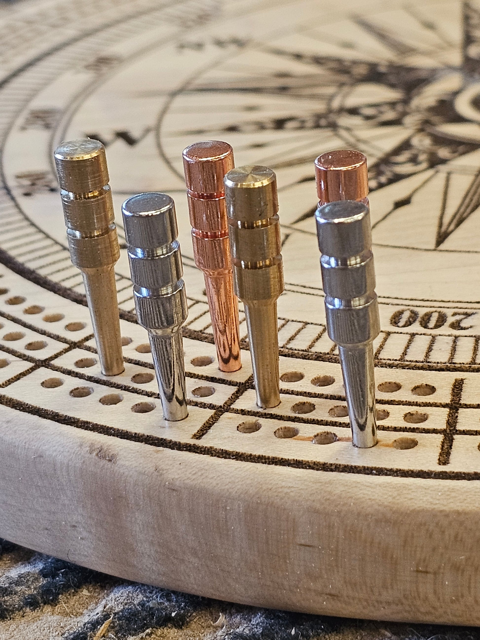 Comes with built-in storage on the back to keep the included metal pegs secure and easily accessible. Whether you're playing at home or taking it on the go, this custom cribbage board is both a functional game piece and a piece of Art