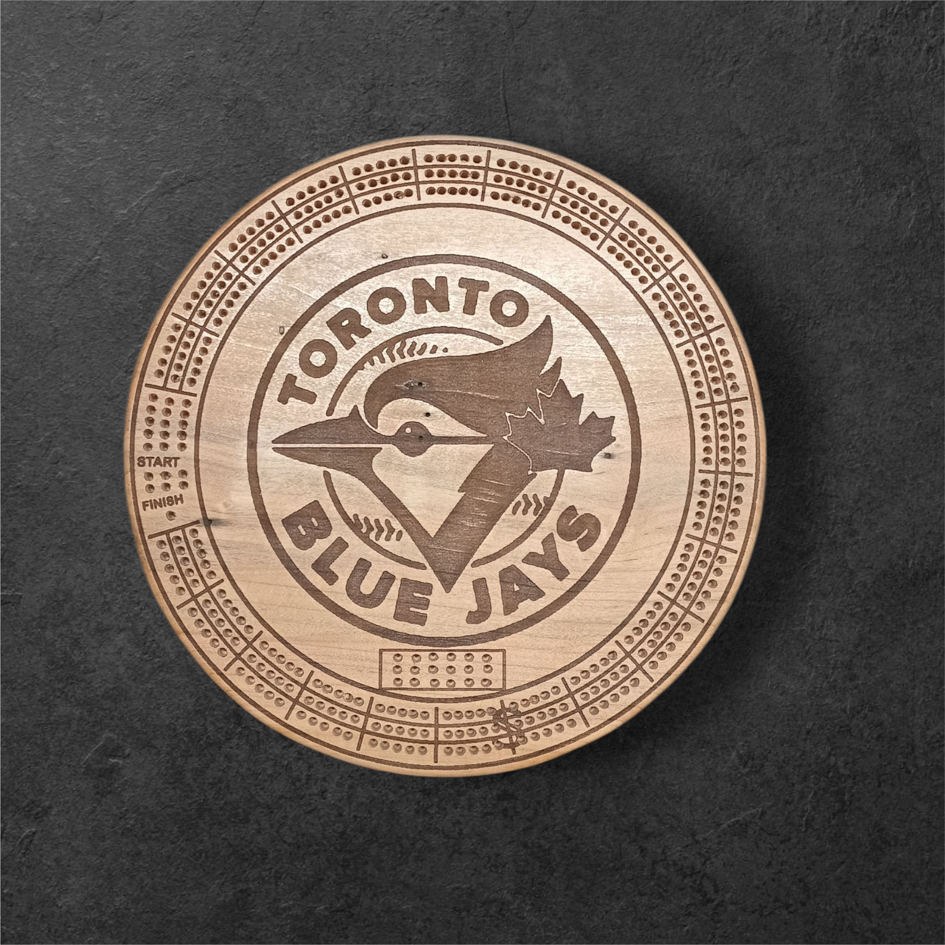 The Toronto Bluejays and other team cribbage boards. Heirloom quality Craftsmanship, beautiful Ambrosia Maple Hardwood. 240mm round or 115mm x 410mm rectangular, and provincial options 310mm x 130mm. Just add your required team in the information box provided for inscriptions.